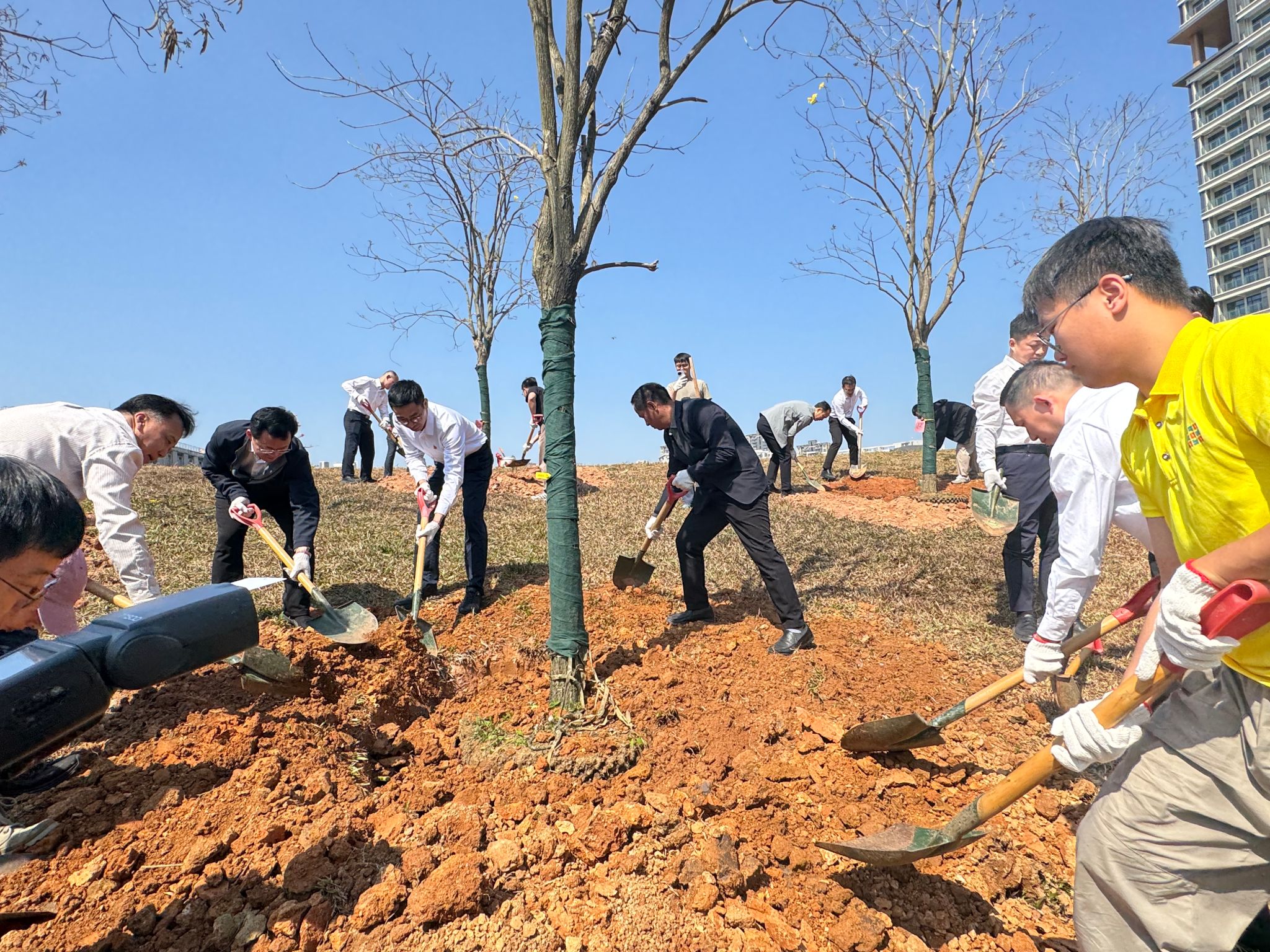 随后,30名师生共同参加了植树活动,通过挥锹培土、提水浇灌等环节,亲身体验植树过程,在劳动中体悟绿色生命的成长与生态保护的责任,将课堂所学的理论认知深化为具体的实践体验。