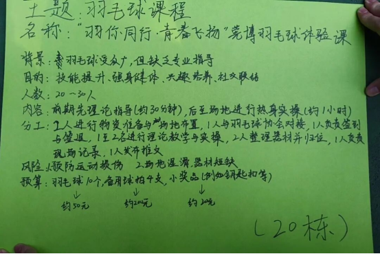 在方案共创环节,同学们结合前期调研与现场讨论成果,凝聚共识、分工协作,梳理形成社区体育活动优化思路与方案初稿,内容涵盖趣味运动会、羽毛球课堂、社区运动空间改造、健康与运动宣传等,并明确了下一步行动计划与负责人员。一个个贴近学生需求、兼具创新性与可操作性的社区运动方案逐步成型,为莞博社区体育文化建设奠定了坚实基础。