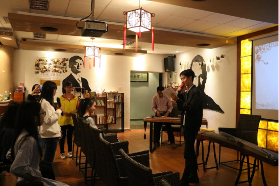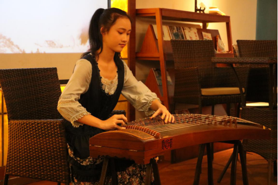 问答环节结束之后,汤锦华老师已在前面点燃了莞香,同时,教育学院(师范学院)的一位学生为大家带来古筝演奏《彝族舞曲》。袅袅的莞香飘动,一缕缕淡淡而独特的香气溢满整个茶室,现场师生伴着婉转的古筝,细嗅淡淡的莞香,仿佛置身仙境。