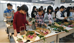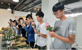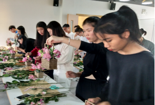 曾慧凤从挑选花朵并去除残枝败叶、主花(玫瑰)填充、细小花朵点缀、提篮检查以及装饰花篮等五大步骤进行演示讲解。通过现场亲自指导与调整,曾慧凤耐心解答学生们的疑问;整个插花过程中,同学们专心致志进行创作,细心调整、精心装饰花艺作品。并且,现场学生踊跃展示自己的作品,并对其花艺创作思路展开讲解;现场氛围热烈融洽、花香沁人。最后,曾慧凤与部分同学将其成品赠与莞馨社区,让花香传递整个莞馨社区。