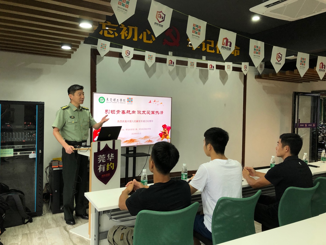 为庆祝八一建军节,弘扬爱国主义精神,营造爱军拥军的校园氛围, 8月1日上午,由学生社区党工委、学生社区知行学院主办,以“引领青春航向,激发爱国热情”为主题的退役大学生军旅生活分享会于莞华社区活动室举行。