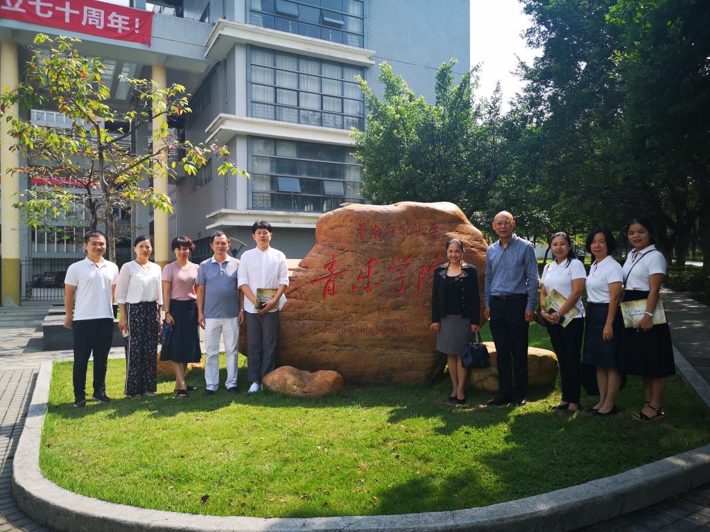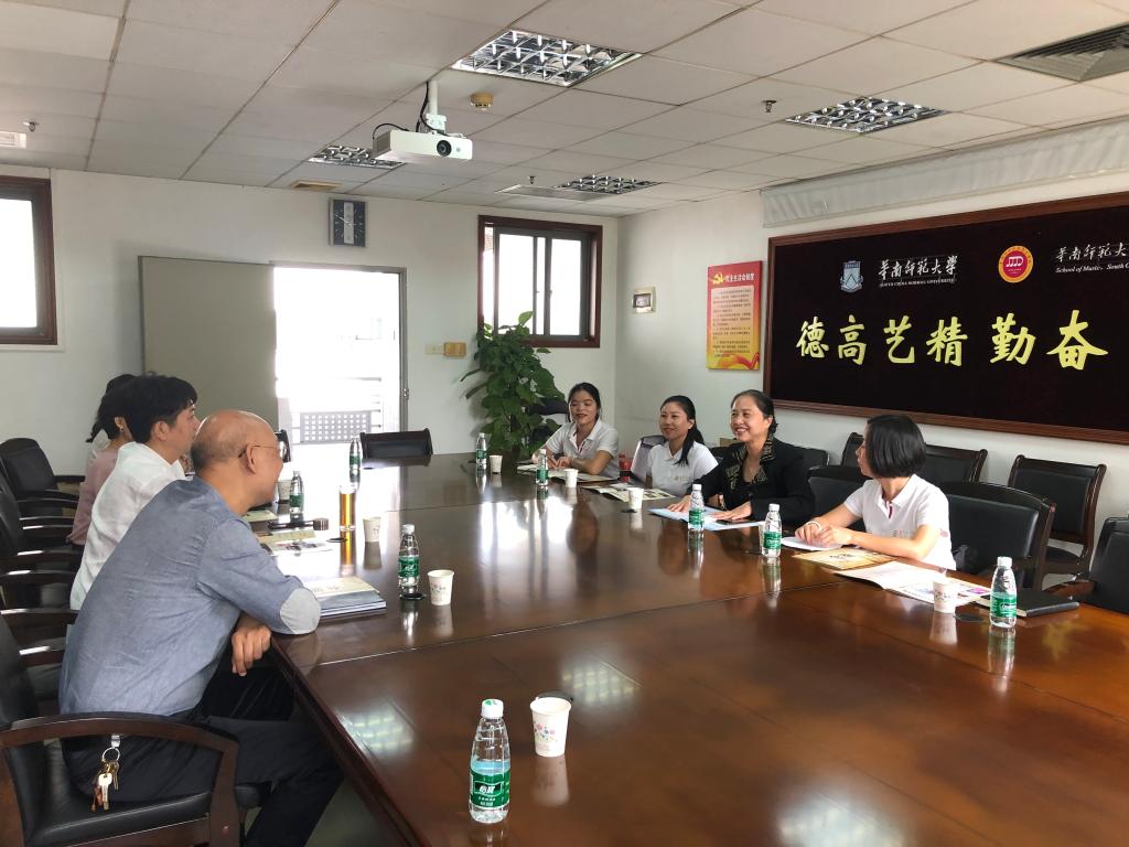 10月16日,我院执行院长苏亚玲,人文素质教育中心主任谈娟,知行课程教师诸小妮,学院工作人员陈丽平、傅都元等一行5人赴华南师范大学音乐学院,就中华优秀传统文化传承基地的建设与发展进行学习调研。华南师范大学音乐学院党委书记余庆、副院长孔义龙、舞蹈系主任王艺波、办公室主任常春、音乐与舞蹈研究所副所长仝妍、舞蹈系教师刘妍等接待团队一行。