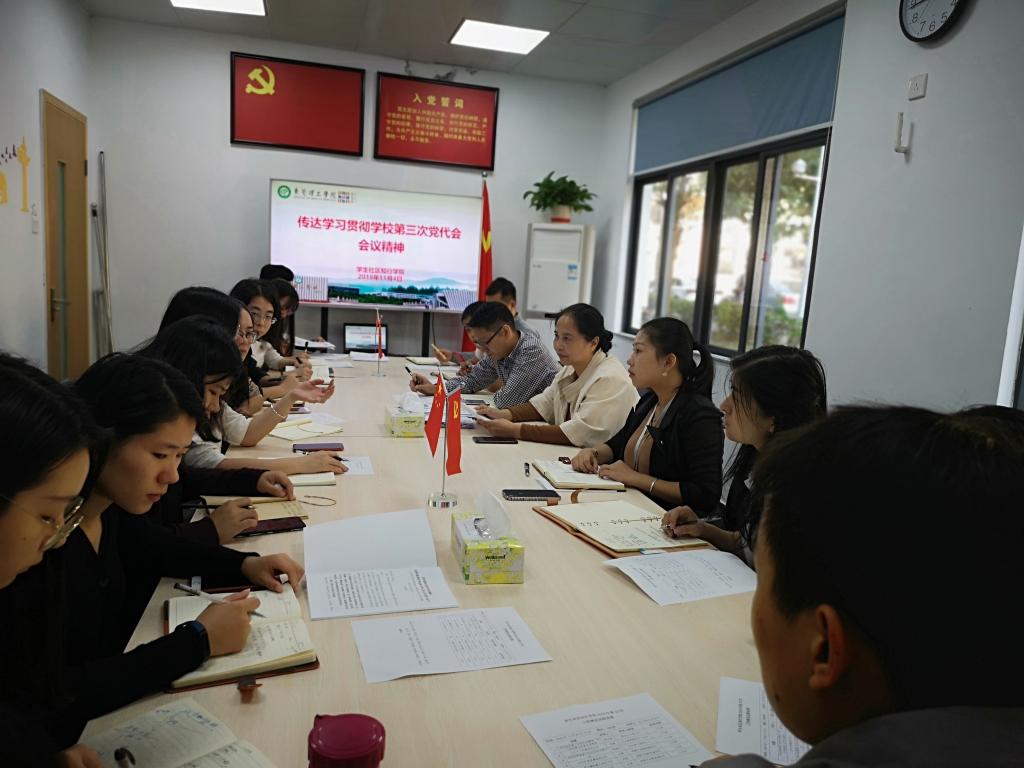 苏亚玲传达了学校第三次党代会精神以及《高举新时代改革开放旗帜,为加快建成新型高水平理工科大学而努力奋斗——在中国共产党东莞理工学院第三次代表大会上的报告》,并对会议情况做简要介绍。学校第三次党代表大会主题:以习近平新时代中国特色社会主义思想为指导,高举新时代改革开放旗帜,抢抓历史机遇,保持战略定力,走高质量、内涵式、特色化发展道路,进一步解放思想,深化改革,扩大开放,集聚资源,全面提高人才培养能力,增强服务经济社会发展实效,为加快建成新型高水平理工科大学而努力奋斗。苏亚玲表示,学院要在回顾第二次党代会以来的各项工作成效的基础上,依照第三次党代会报告进行操作,开展针对性工作。