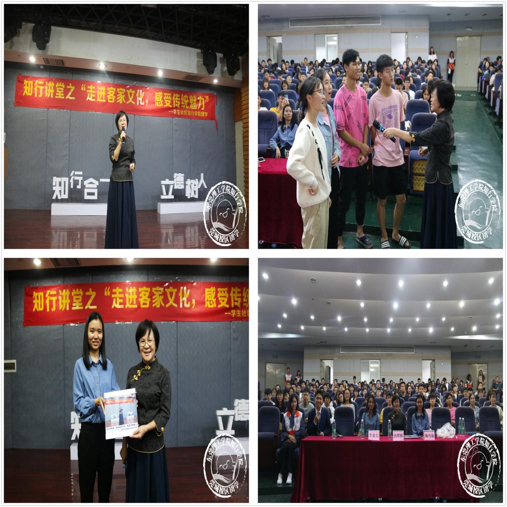 为了响应习近平主席对弘扬中华优秀传统文化的高度重视,增强文化软实力,11月7日晚上,学生社区知行学院在莞城校区小剧场举办了“走进客家文化,感受传统魅力”主题讲座。参与此次讲座的有主讲嘉宾孙翠媚老师,知行学院老师吴云开、赖巧敏,驻校社工以及230名学生。