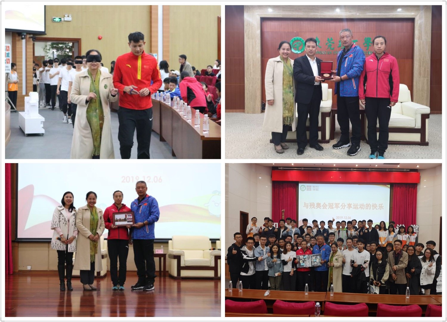 12月6日,知行讲堂“奥运冠军,我想与你分享运动的快乐”在松山湖校区学术会议中心报告厅顺利举行,邀请两届残奥会田径女子100米冠军周国华、残奥会金牌教练胡正观到场分享追梦故事和成功经验。校长马宏伟,知行学院执行院长苏亚玲出席活动,中国残疾人田径队教练、领跑员、队员,知行学院相关工作人员及480余名学生代表参加讲堂。