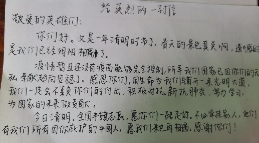 活动征集作品形式不限,学生积极参与,尽己所能表达对英烈们的感恩与追忆,有朗诵诗歌、录制视频、写信等各种各样的方式。此次活动借助清明节为契机,鼓励学生表达对革命先烈、抗疫牺牲的英烈们的深切怀念和诚挚的敬意。