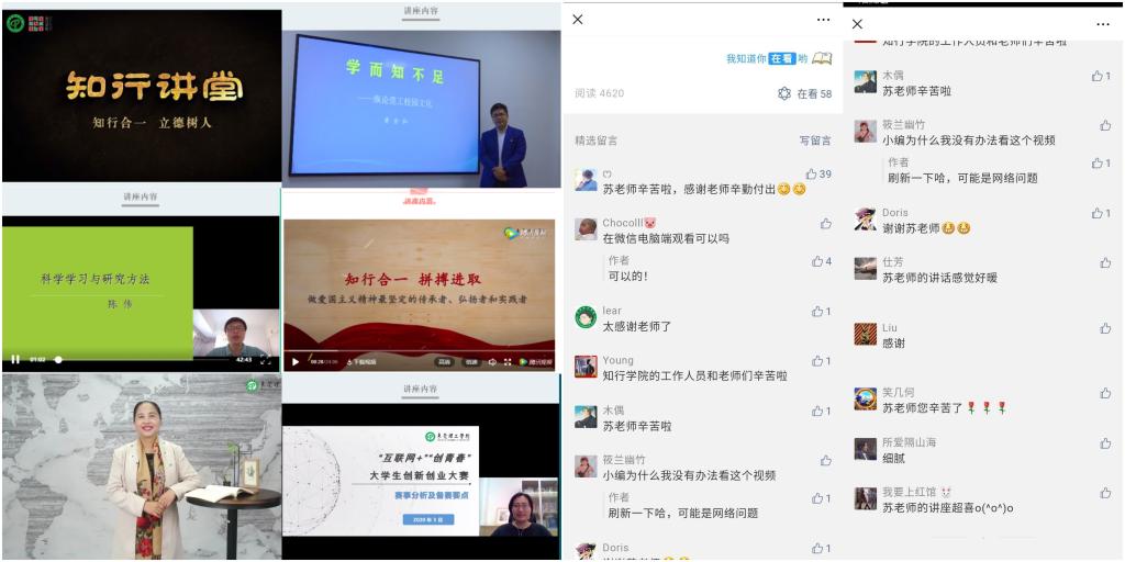 一场突如其来的疫情,给我们开展“知行讲堂”带来了挑战。为贯彻落实教育部“停课不停学”的疫情防控工作要求,学生社区知行学院结合在疫情阶段学生的思想心理需求和社区教育工作实际,从2月下旬至今开展系列线上“知行讲堂”共计8场,学生参与度高,反响热烈。