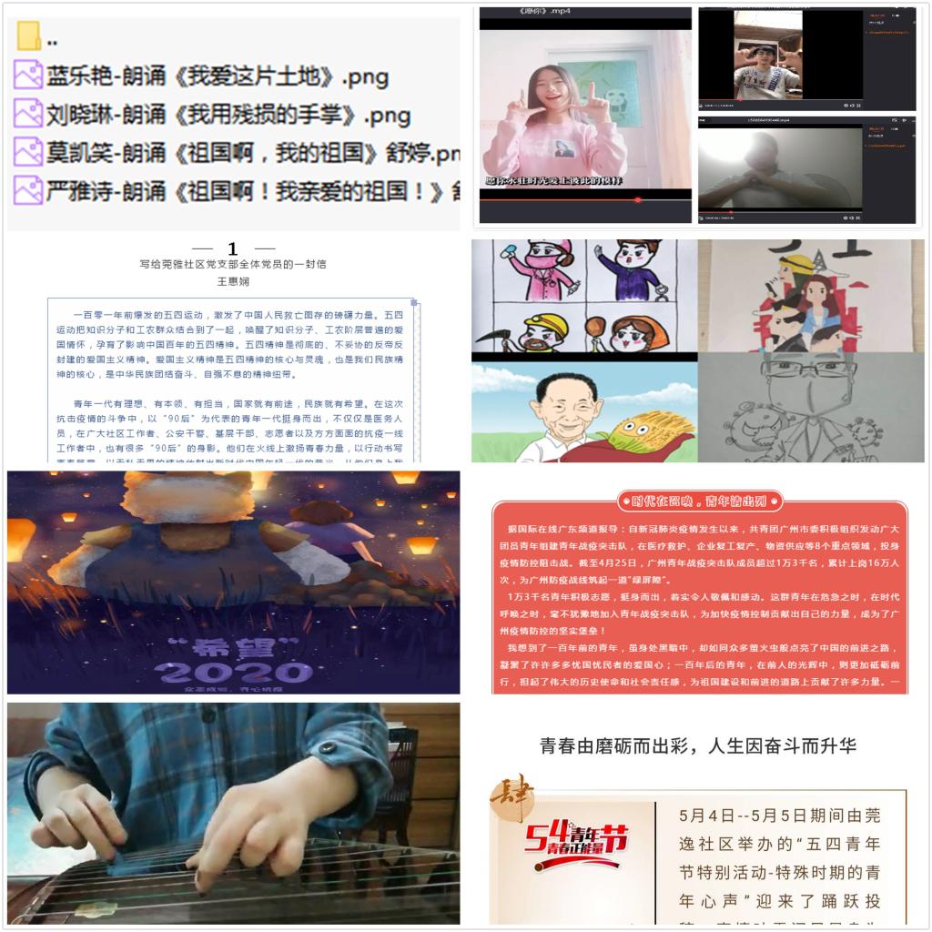 活动围绕多个小主题分两校区进行,累计参与549人,活动相关点击量达2526次。松山湖校区,莞馨分院以“‘馨’起点,‘新’发现——疫情后的新生活”为主题,号召同学们用视频和文字的方式分享生活中的新想法和新发现;莞逸分院以“五四青年节特别活动——特殊时期的青年心声”为主题,让青年发声,为青年喝彩,呼吁同学们发出“青年之声”,分享疫情期间的相关感想和感悟;莞华分院以“心如花木,向阳而生”为主题,以手语代替口语的形式,推出线上手语教学,带领同学们学习新技能;莞雅分院以“传承五四精神,展现青年风采”为主题,以“给莞雅党支部全体党员一封信”的形式号召同学们向党学习,传承并发扬五四精神;莞博分院以“朗读者——青春酌酒,理想成诗”为主题,带领同学们以朗诵的形式,拍摄短视频,展示五四风采,体现爱国主题教育;莞城校区,莞思分院以“‘妙笔生花 致敬英雄’——手绘人物活动”为主题,以手绘劳动模范或青年榜样的形式,将人物付诸于纸上,发扬勤劳刻苦的精神;莞和分院以“‘弘扬五四精神,展现青春风采’主题党日活动”为主题,用镜头记录同学们的多姿才艺。