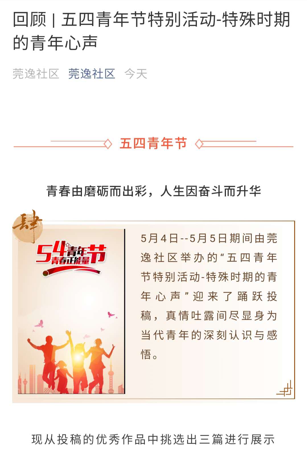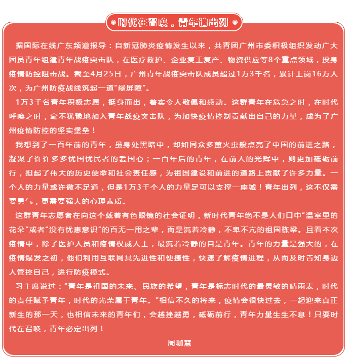 青年节,让青年发声,为青年喝彩。5月4日至5日,莞逸社区开展五四青年节特别活动-“特殊时期的青年心声”主题活动,向奋战在疫情一线的所有青年工作者致敬。