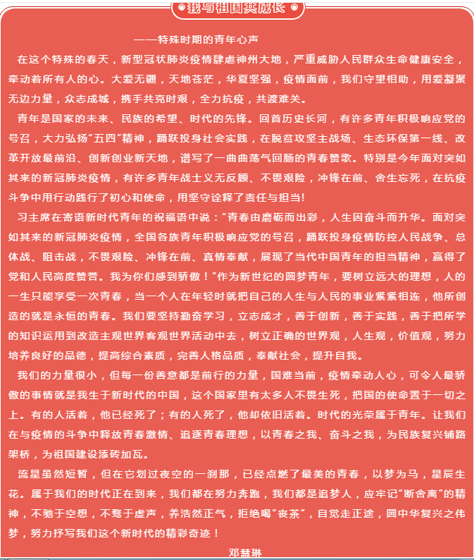 此次青年节活动,为同学们提供了表达青年心声的平台。在同学们的投稿作品中,我们看到新一代的青年正如骄阳冉冉生,光照人间、熠熠生辉。