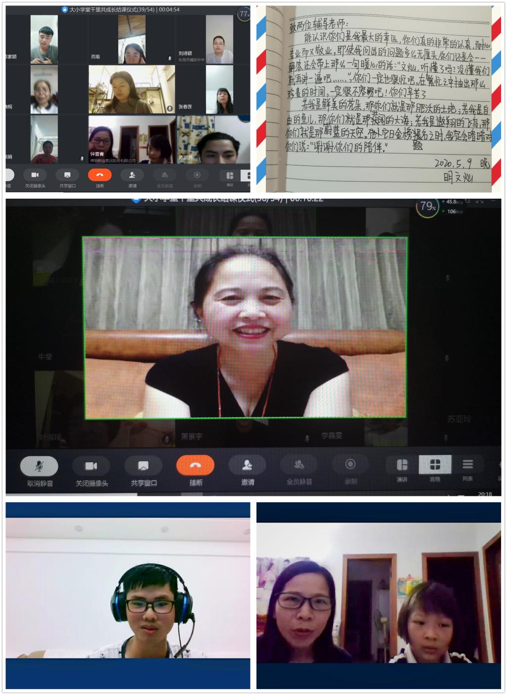 在结课仪式开始前,小老师与小学员以互传书信的方式回味这段通过网络携手成长的时光,相互表达感激之情。三名志愿者代表纷纷表示,“这次线上大小学堂活动,不仅仅是大学生在教学上帮助小学员,还是一个与小学员互学互鉴,包容与理解的过程,他们耐心听讲、善于思考,遇到不懂的会大胆地提出来,也会很委婉地指出老师的错误之处以便我们不断改进,教学相长。”
