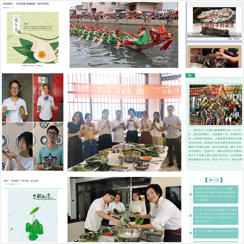 活动内容丰富,形式多样,既有包粽子送祝福、宿舍走访送关怀等线下活动,也有诵读经典文学、记录身边的端午习俗、传统文化知识小测试、端午节微视频征集等线上活动。其中,松山湖校区以“佳节临端午,粽子送祝福”“浓情端午,千古习俗”“纪念屈原,诵读经典”“浓情端午,粽情于你”“端午话习俗”为主题,莞城校区以“粽香飘万里,知行祈福荫”“端午事,端午情”“品味端午,传承文化”为主题。