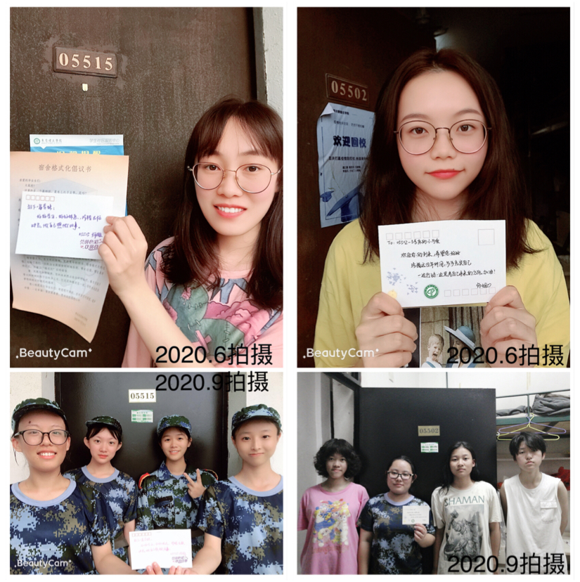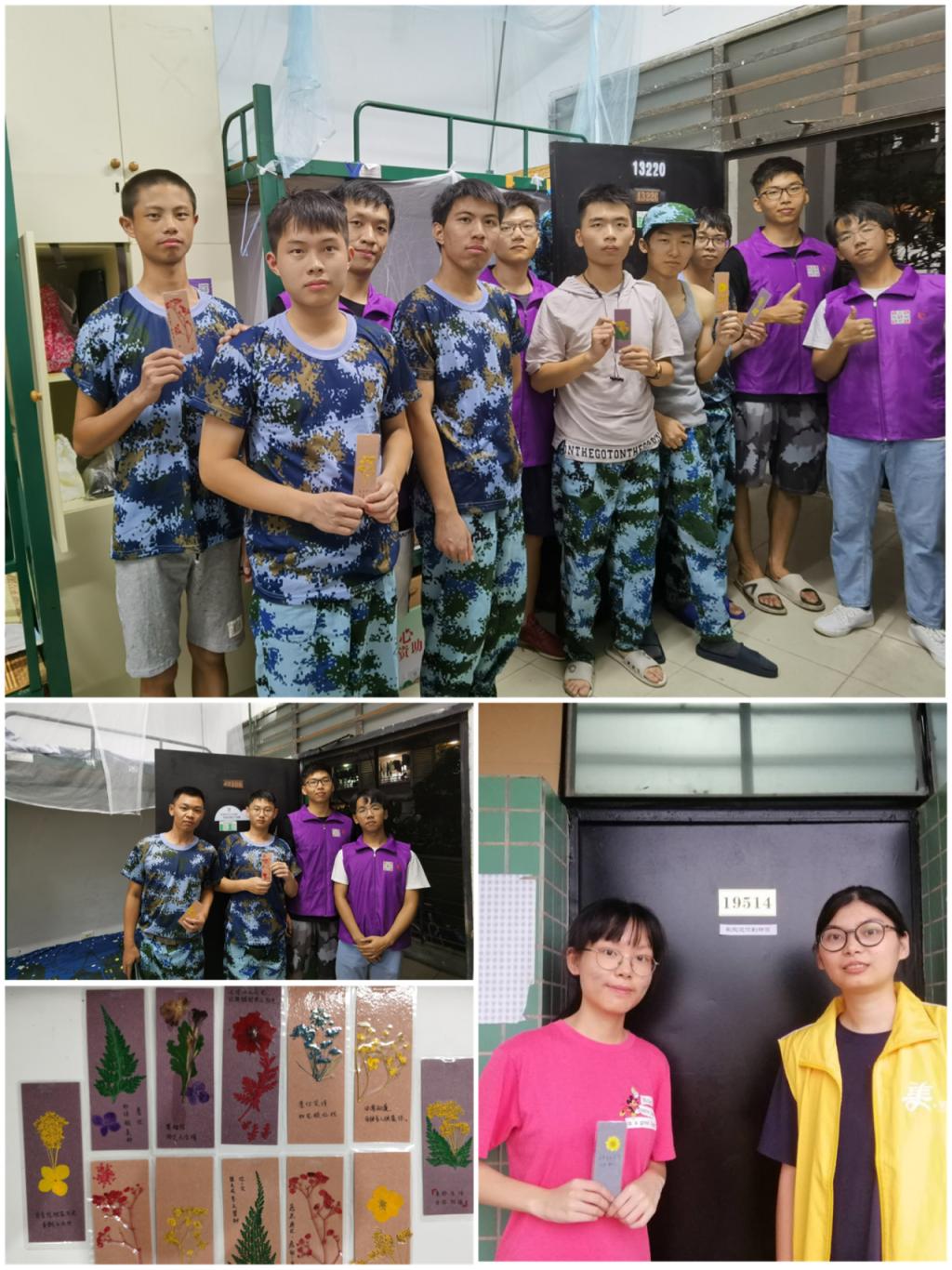 来自莞馨分院05502宿舍邱丹萍同学,收到了知行学院第一届学生会主席苏榆在毕业季离开宿舍前写下的祝福:“05502-3号床的小可爱:欢迎你的到来,希望你好好珍惜这四年时间,多多充实自己,一边行动一边思考自己未来的方向。加油!”邱丹萍同学表示,收到师姐的祝福又惊喜又感动,很感谢师姐的祝福;05515的四个小师妹则异口同声地说要把“原住民”师姐的“好好学习,好好休息,珍惜在校时间,做自己想做的事”贴到宿舍门上,以勉励她们好好珍惜大学四年时光。莞雅分院19514宿舍和莞华分院12108宿舍,同样收到了上一任住户的祝福——师兄师姐亲手制作的压花书签,书签上或秀丽、或潇洒的字迹写着“室友要友好相处哦”“给自己信心,你远比想象中优秀”,拿着这亲手制作、满满诚意的书签,莞华12108蔡同学说:“军训了一天,本来很累了,但是收到了来自学长学姐的祝福,感觉很幸运。”