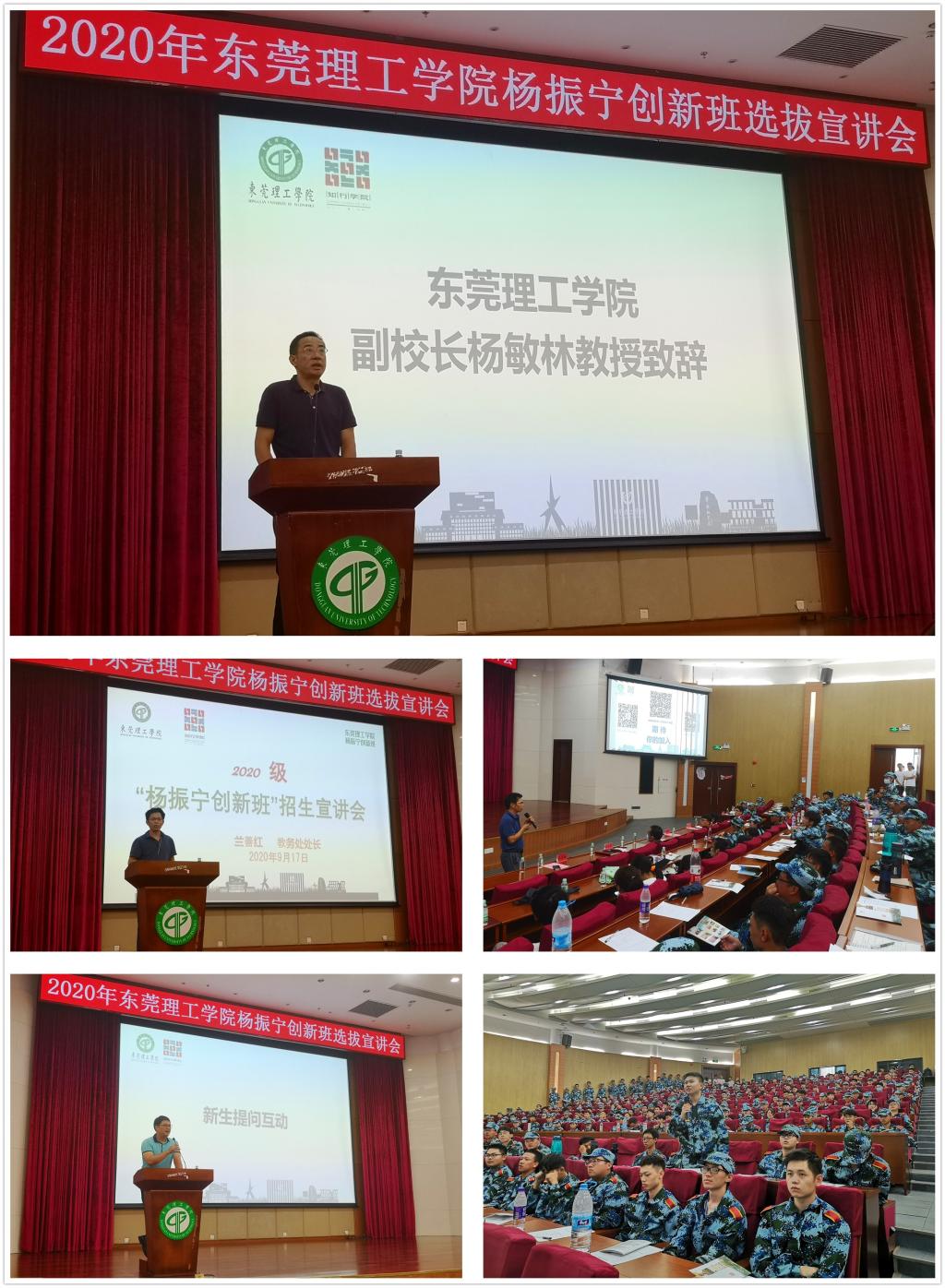 9月17日,我校2020级杨振宁创新班(以下简称为“杨班”)新生选拔宣讲会于松山湖校区会议中心报告厅举行。校党委委员、副校长杨敏林,教务处、知行学院相关负责人,“杨班”辅导员以及通过初轮资格审核的470余名2020级新生出席宣讲会。会议由教务处副处长廖文波主持。
