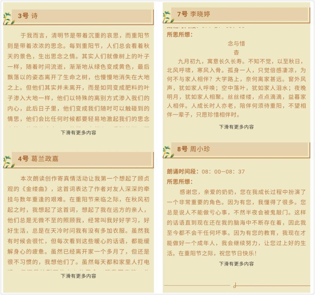本次活动采用“朗读诗歌”和“抒发感想”两种方式进行投稿征集,同学们精心准备,为我们带来了有温度有力量的声音与文字。在同学们的作品中,大家通过朗读诗歌表达我们对亲人的感恩,通过创作感想尽诉对友人的思念。声音与文字相结合,向远方传递着我们的真情。