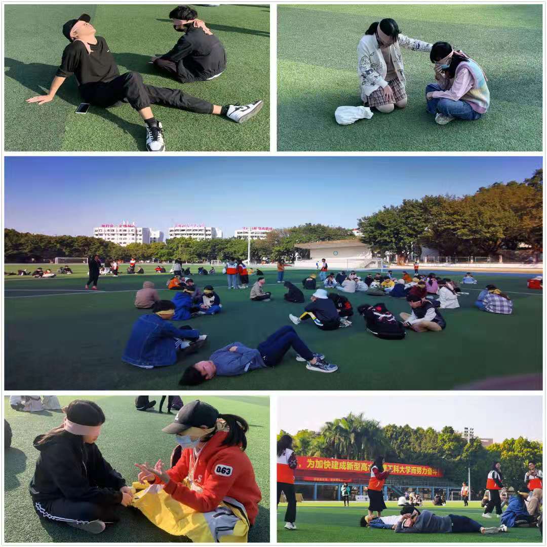 本次活动分为五个环节:蒙眼匹配、互相交流、围圈识人、交流分享、交换书签。在交流过程中,同学们蒙上眼睛,放下手中手机,心无杂念,呈现自己最舒服最自在的状态,其中有同学轻躺在操场上,用心交流,细心倾听,主动关怀。简短愉悦的聊天后,工作人员打乱聊天组合,让同学们在人群中寻找伙伴,围圈识人充满着各种惊喜。接着分享环节中,沟通需要艺术同时也需要切入点,有聊关于彼此的家乡,童年的回忆等话题。最后同学们在书签上写上对小伙伴的祝福并送予对方。吴云开表示:我们要练习自己的交流能力,加强短板,积极地迈出去,而且在大学里能找到与自己三观正确的人,是我们的缘分。