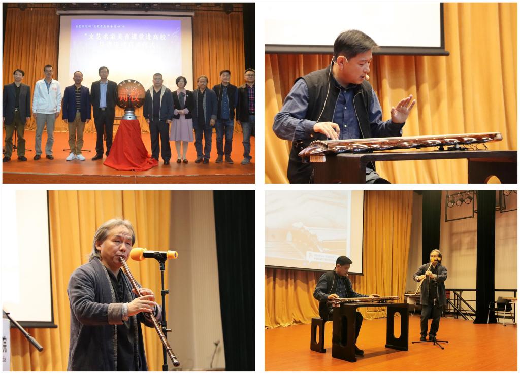 活动现场,首先由出席嘉宾共同开启启动仪式,揭开了“文艺名家美育课堂进高校”的序幕;其次,王可逊老师讲解了古琴艺术的历史渊源、发展脉络和艺术特色,同时,示范演奏了古典名曲《流水》,并演绎弹唱现代曲琴歌《将进酒》,另同学们大饱耳福;随后,刘汉超老师以《多彩的管乐世界》为主题,讲解了中国古代民族管乐乐器的种类和风格特点,向学生们介绍了民族管乐中不同材质的器乐品种,及其风格特点和演奏技巧,并以“埙”“箫”“尺八”为例,边讲解边示范演奏,用音乐带大家领略不同的意境;最后,刘汉超和王可逊两位文艺名家合奏古曲《碧涧流泉》以及线代曲《枉凝眉》,用乐曲代替言语的繁琐,传达知音之声的同时,将现场氛围引向高潮。