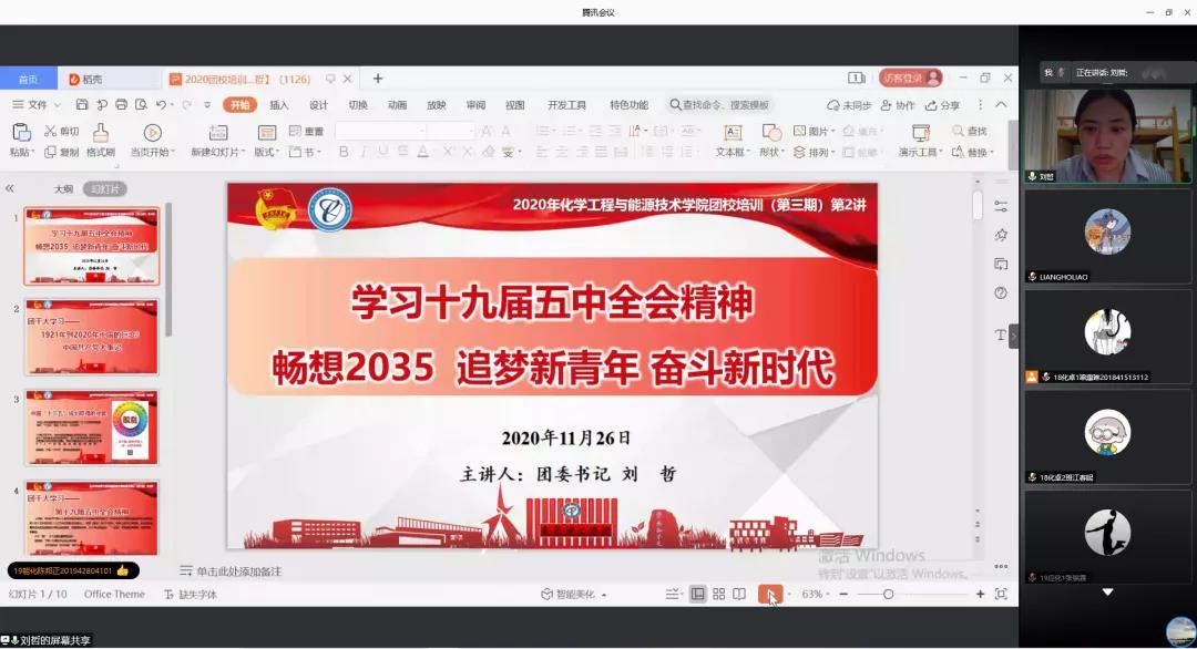 知行学院莞馨分院联合化学工程与能源技术学院团委于11月26日通过腾讯会议开展第三期团校培训第二次授课。化能学院团委书记、莞馨分院辅导员刘哲为同学们进行了团校培训第二次授课。化能学院各级班长团支书、化能团学委员会、化能团学全体工作人员以及莞馨导生近百人一同参加培训学习。