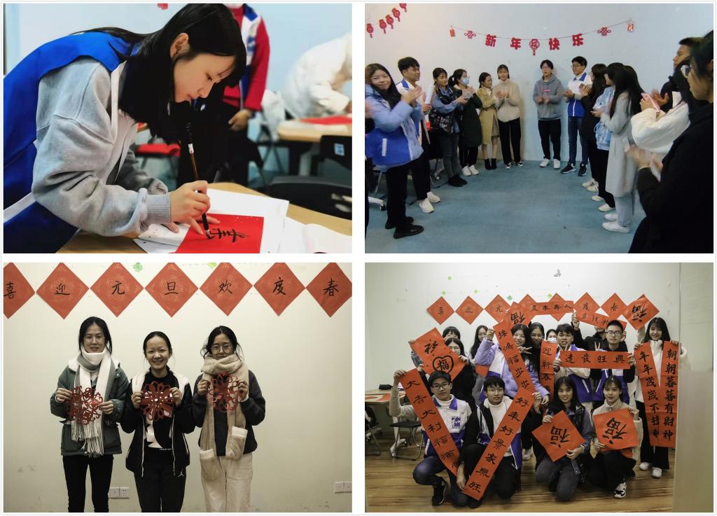 活动分为四个环节进行,第一个环节是剪窗花,参加者分为4组进行,裁剪窗花过程中同学们互帮互助,裁剪完成的同学与舍友合影留念,展示宿舍的团结友爱。接着,学生挑选心仪的对联,一笔一划描摹着,为宿舍创作一幅独一无二的手作,展现各具特色的宿舍文化。在欢乐的“数字配对”游戏后,大家进入送祝福环节,表达自己的新年祝福。