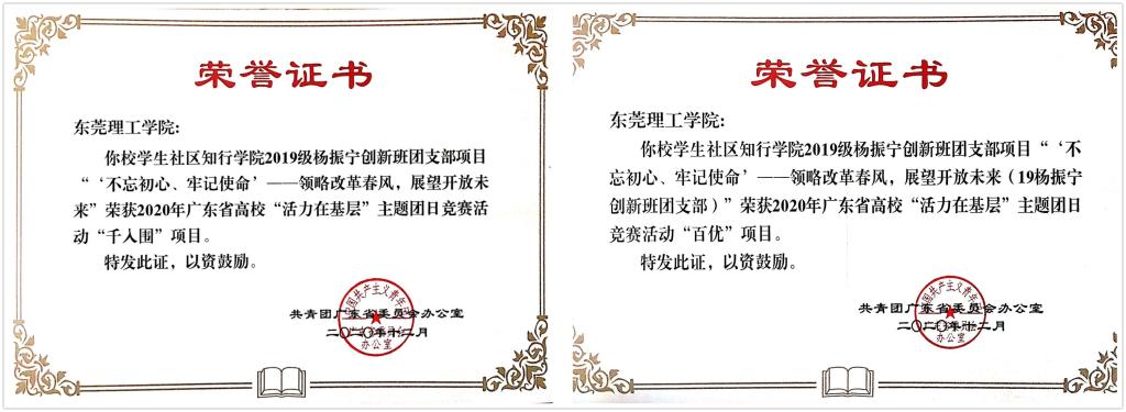 近日,学生社区知行学院2019级杨振宁创新班团支部项目“‘ 不忘初心,牢记使命’——领略改革春风,展望开放未来”荣获2020年广东省团日活动竞赛“千入围”和“百优”项目。