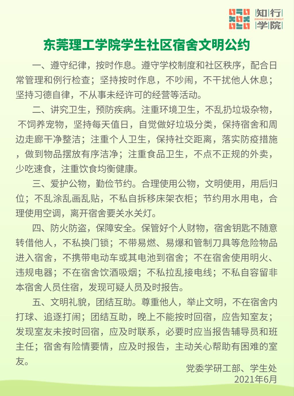为倡导社区学生形成良好的生活习惯,积极创建文明、和谐的宿舍人际关系,学生社区知行学院于6月16-17日开展《学生社区宿舍文明公约》宣传活动,7个社区累计走访共计3742宿舍间。