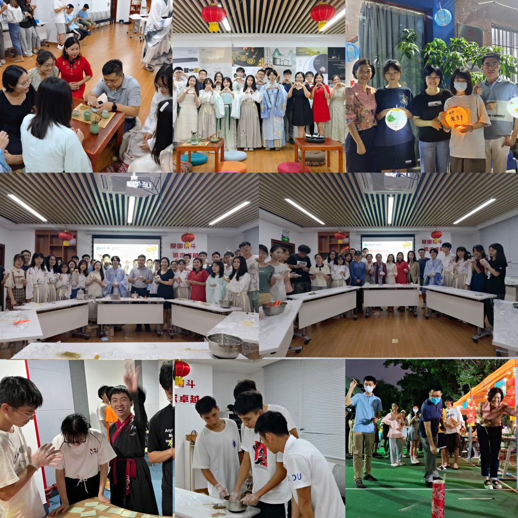 9月21日晚,“中秋之夜”在两校区分别举行,学生社区党工委、知行学院以及莞城校区党工委相关负责人和全体老师参加了相关活动。活动以中秋为主题,“品月赏中秋”手工月饼制作、“品香会师友”香艺体验、“品茶叙佳话”茶艺表演和传统服饰展等室内活动,还有“壶中日月”“水中捞月”“心心相印”“花好月圆”“临风对月”“花前月下”等游园活动,师生欢聚一堂,共度佳节,学生社区洋溢着“家”的温暖。