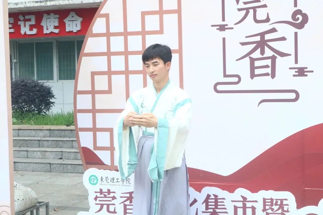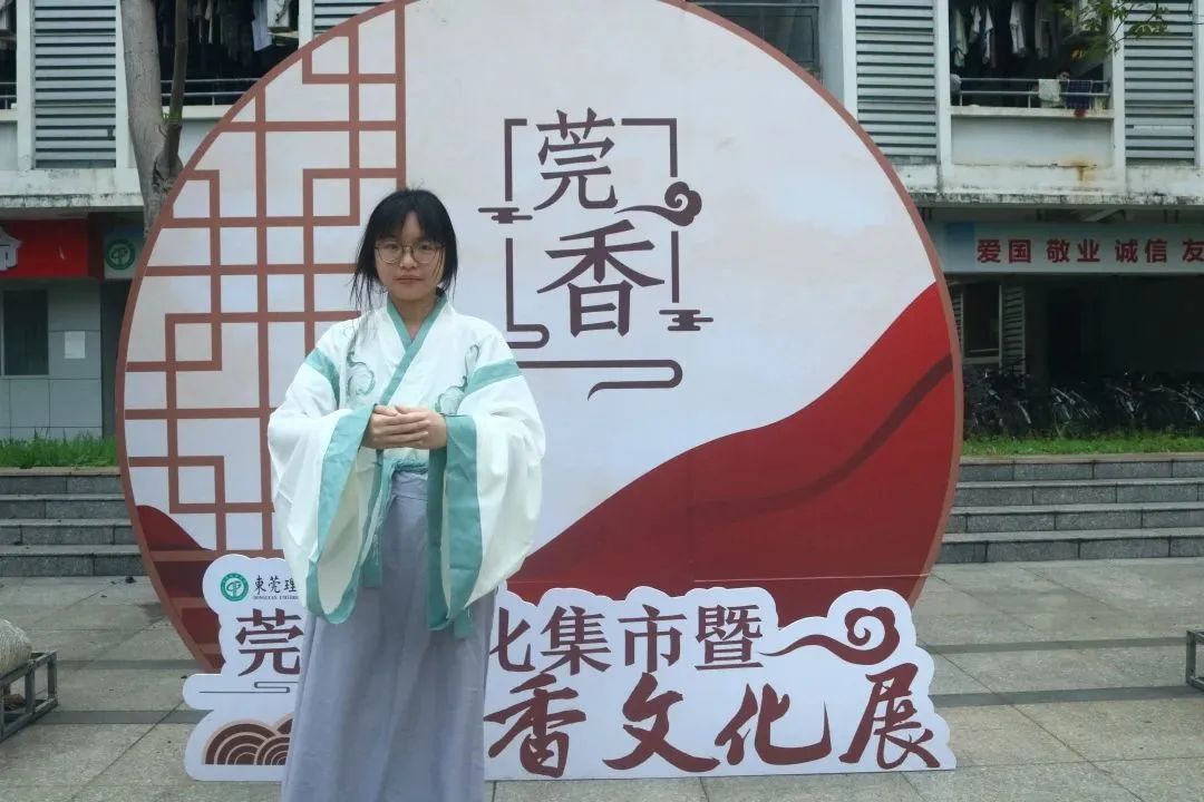 活动设置游园打卡点,在知行广场莞香主背景板处,同学们纷纷穿着汉服、唐装、旗袍等传统服饰前去打卡拍照。