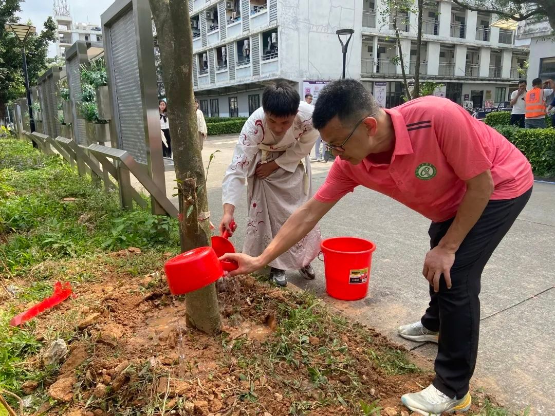 活动现场,阎江老师带领师生一起扶树、培土、浇水,干劲十足。
