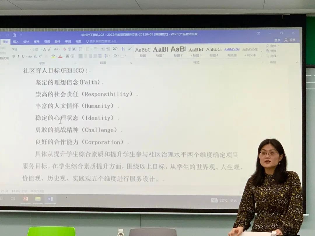 滕爱聪老师还根据社区育人目标(FRIICC) ,即坚定的理想信念(Faith),崇高的社会责任 (Responsibility),丰富的人文情怀 (Humanity),稳定的心理状态 (Identity),勇敢的挑战精神 (Chal lenge),良好的合作能力 (Corporation),说明了如何理解社工服务的定位。通过分析具体目标体系等内容,提出未来工作应当实现总项目和分项目的有机整合,需求与服务相对应,服务成效总结打破纯量化测评的迷思,做到定性与定量相结合、逻辑论证与结果测评相统一,通过目标设置实现社工专业服务与学校人才培养的话语体系互通和价值理念融合。