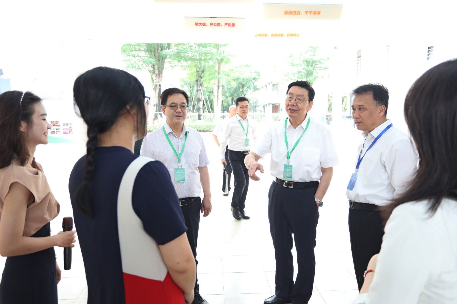 专家组一行参观了“三全育人”成果展,校学生会主席团成员、21级音乐学专业刘雨锜同学讲解学校围绕学生成长成才开展的各项工作,包括思想政治教育、学风建设体系、校园文化活动、心理健康教育、劳动育人成果及知行课程等内容。随后,专家组参观莞逸社区三室及廉洁文化知行教育馆,了解社区基础设施建设、学生队伍培育、知行课程体系。