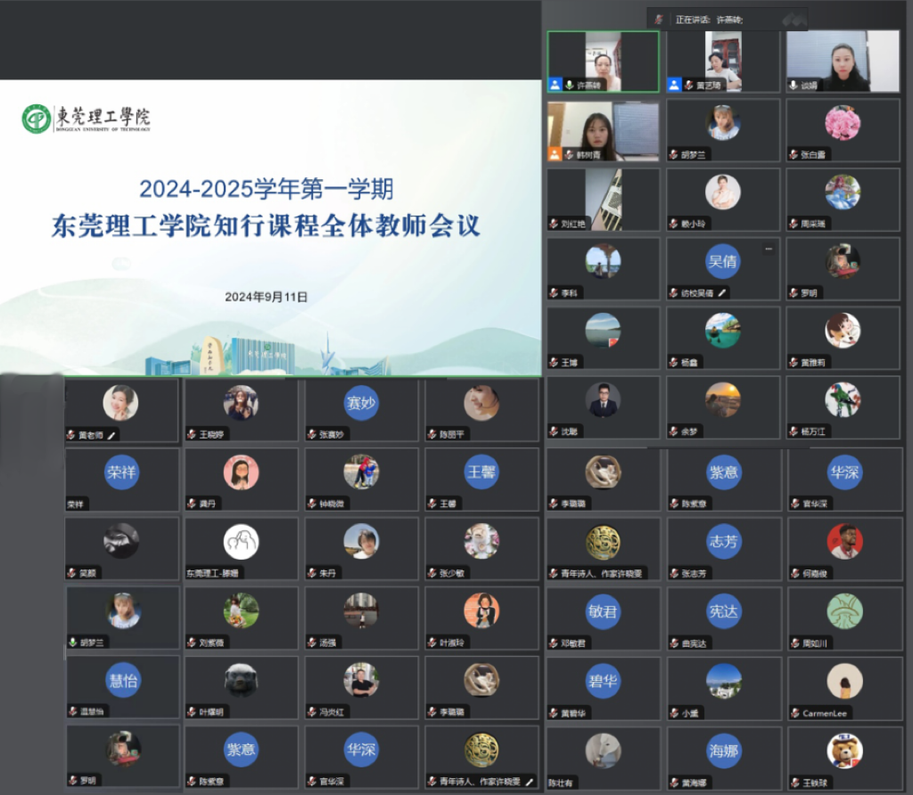 9月11日下午,2024-2025学年第一学期知行课程教师全体大会在腾讯会议举行,教务部副部长、学生社区知行学院(通识教育学院)副院长许燕转,知行学院党总支副书记黄艺琦,全体知行课程教师参加了本次会议。