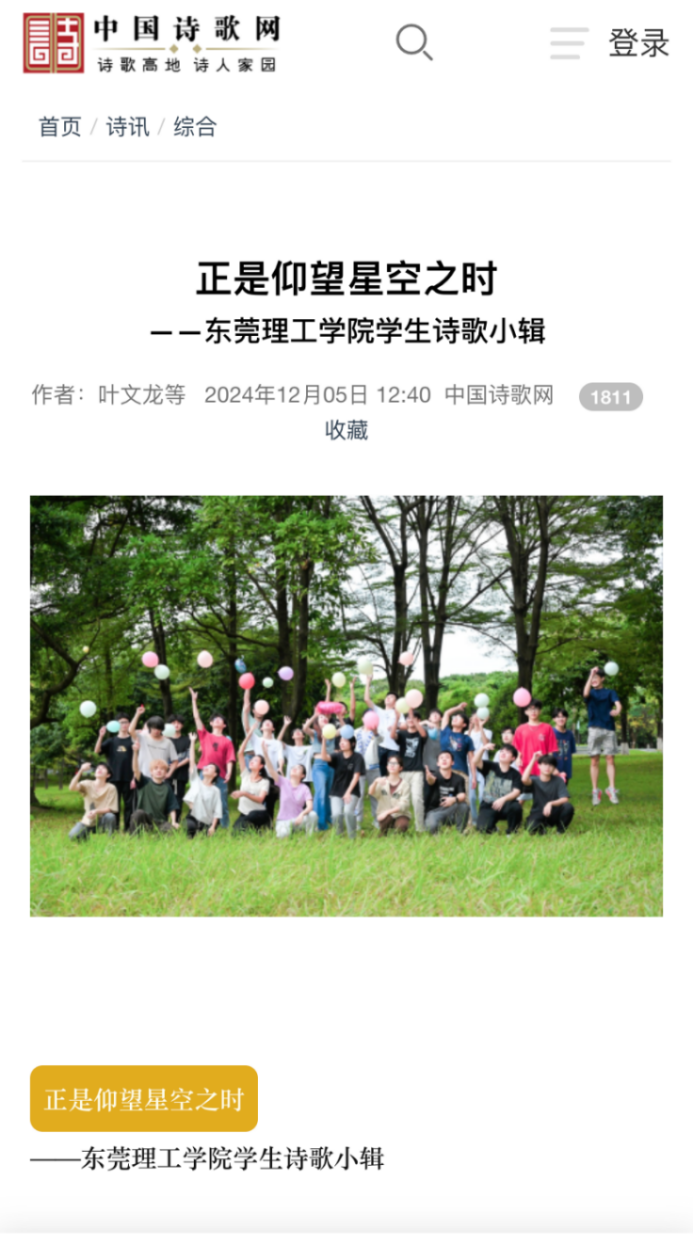 12月5日,该课程叶文龙、曹宇晖、杨烨等15名学生的课堂作品成功发表于中国诗歌网,这一成就不仅展现了学生们的文学才华,也体现了知行课程的育人成效。中国诗歌网,简称“中诗”,是国内唯一一家官方主办的诗歌网站,也是中央文字资助的国家级文化重点工程。知行课程《如何走进诗歌的心灵世界》通过创新,将诗歌理论教学带入企业文化,让学生在实践中领悟诗歌与生活的紧密联系。这种教学模式不仅拓宽了学生视野,也深化了他们对诗歌深层意义的理解,同时培养了他们的创新精神和社会责任,为未来职业发展打下坚实基础。