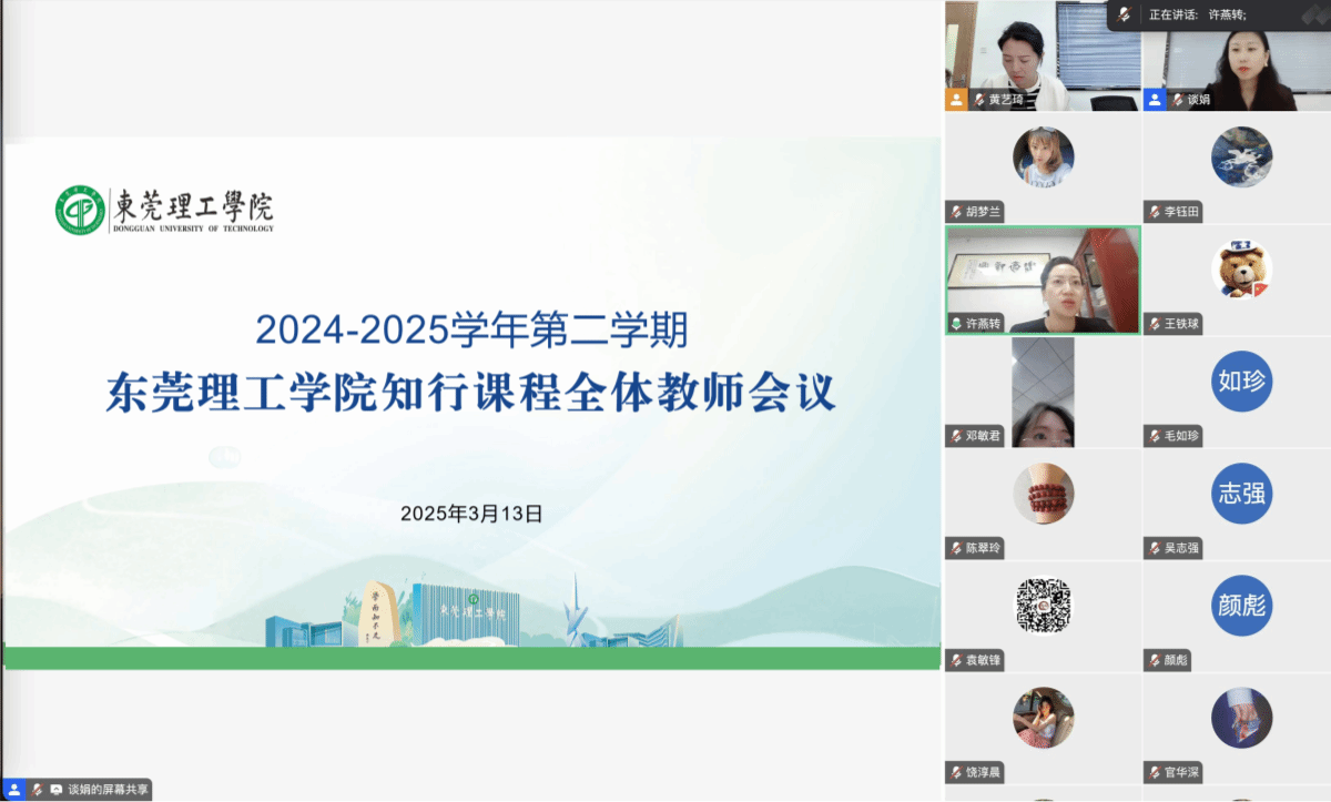 3月13日下午,2024—2025学年第二学期知行课程教师岗前培训在腾讯会议顺利召开,教务部副部长、学生社区知行学院(通识教育学院)副院长许燕转,知行学院党总支副书记黄艺琦,本学期77名知行课程教师参与此次会议。本次会议旨在帮助教师更好地了解本学期知行课程的开课情况、相关要求以及师德师风建设的重要性,进一步提升教学水平,确保课程高质量开展。